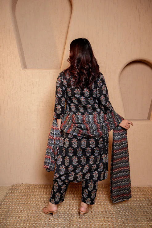 Elevate your everyday style with this elegant black printed suit set, featuring a floral kurta, matching straight pants, and a soft-flowing dupatta. Crafted for comfort and charm, it’s perfect for both casual outings and workwear.